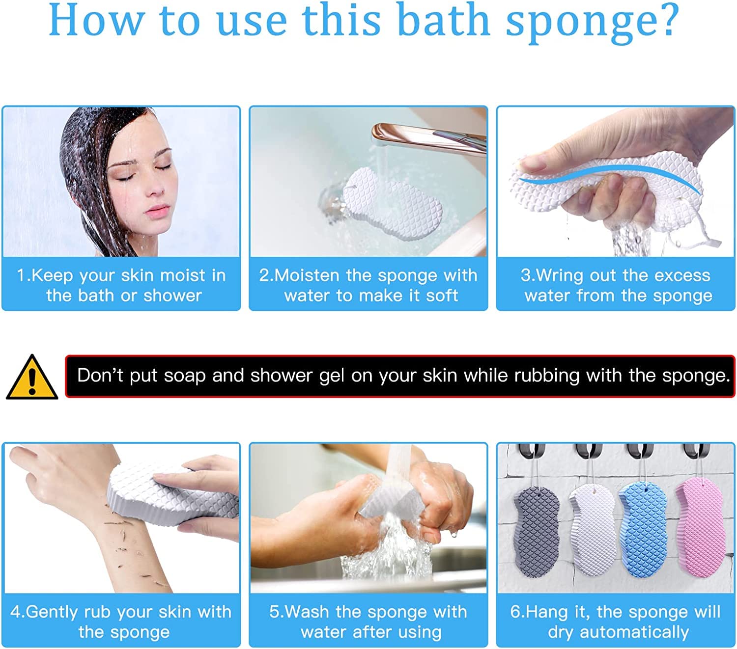 - [Durable]: 3D shower sponge can be repeatedly used. It will become soft after soaking when exposed to water and it will harden after drying. We suggest you rinse it completely and hang it to dry after every use to keep it clean.