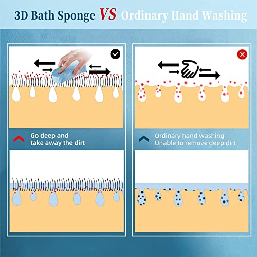 - [Durable]: 3D shower sponge can be repeatedly used. It will become soft after soaking when exposed to water and it will harden after drying. We suggest you rinse it completely and hang it to dry after every use to keep it clean.