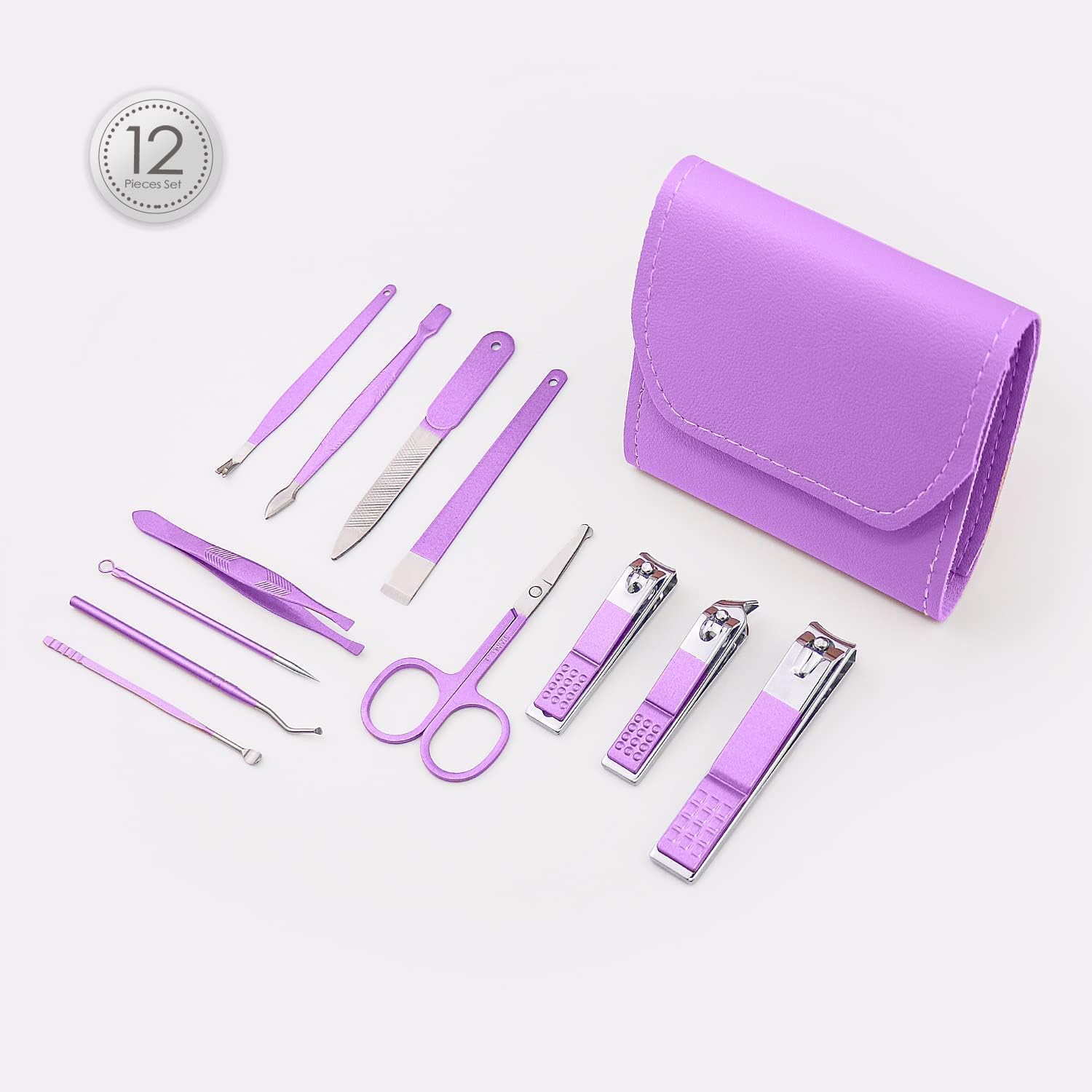 Manicure Pedicure Kit for Women for Foot, Hand & Face Care with TRAVEL Case | Nail Cutter Kit Set, Nail Clipper, Eyebrow Scissors, Tweezers, Nail File, Grooming Kit for Men & Women - 12 in 1 Kit (Purple)